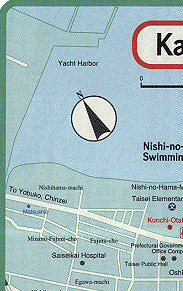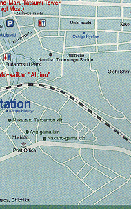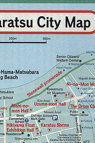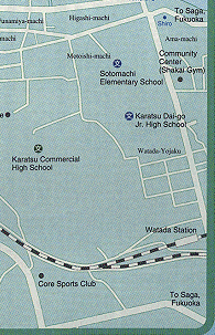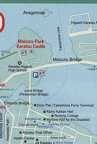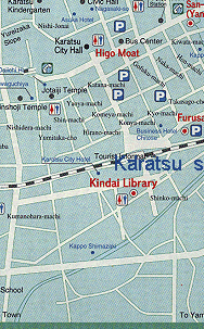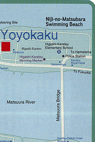 How to get to Yoyokaku. Do you see Matsuura Bridge on the map? And Maizuru Bridge? In between Maizuru Bridge and the north end of Matsuura Bridge, there is a traffic signal at the upside down T roads. Then at the second corner on the left, you will see a small cigarette shop, and here please turn to the left. You will find Yoyokaku on your right. An old wooden two-storied building. The parking lot is around the far corner of the building. Thank you. |