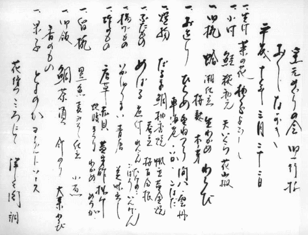early spring. The materials are as below. Appetizer: Rape flower,Yuzu Appetizer: Salmon, Chum salmon roe with fermented rice Soup: Clam, Seaweed, Warabi (plant) Sashimi :Flounder, Great amberjack, Sea Urchin, Shrimp, Squid ,Japanese gizzard shad Grilled: Sea bream, Scallop, with Broad bean,Lily root Cooked in soy-sauce: Rockfish with lotus root, bamboo-shoot, burdock, garden bean Deep fried: Squid soft roe with sweet pepper Vinegared: Bloody clam with cucumber, sea-weed, mioga Miso-soup: Black sea-bream with green onion Rice: Sea-bream Chazuke Pickles: assorted Fruit: Strawberry with Yogurt |