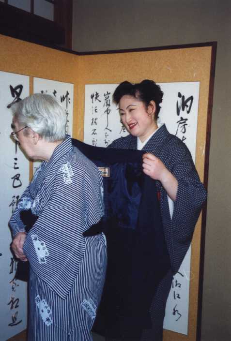 Wear YUKATA and HANTEN. In a Japanese style lodging place, you will enjoy@wearing YUKATA (simple cotton kimono) and an OBI (sash ). You can wear YUKATA at dinner, or going to bath, even outside of the ryokan. Looking at your YUKATA, people will know at which ryokan you are staying, and they will welcome you to the town. You can have HANTEN (half-coat) over YUKATA if you feel cold, orTANZEN (full-length over-coat), or both. I'd be happy to help you change. We have large size YUKATAs. Miyoko |